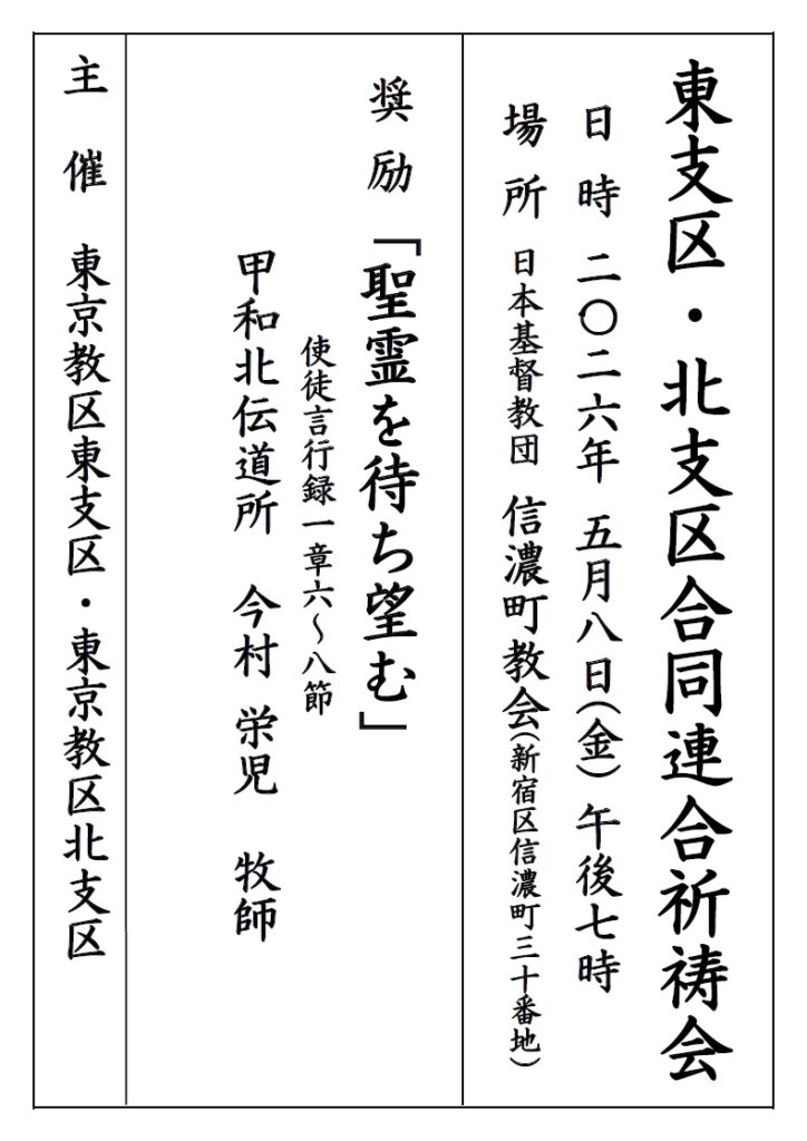 【5月8日】東支区・北支区合同連合祈祷会のお知らせ(信濃町教会、午後7時) お知らせ 2026.04.18 東支区・北支区合同連合祈祷会日時:5月8日(金) 19時~20時30分会場:信濃町教会(北支区会場教会)